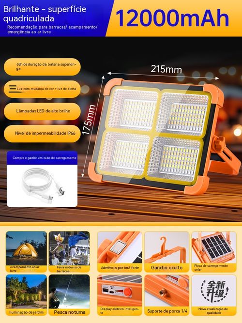 Luz solar para exterior, carrega telemóveis, pode ser fixada ou pendurada. Essencial para casa, camping e vendas ambulantes!