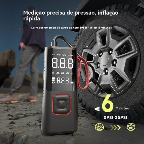 É bomba de ar e carregador portátil ao mesmo tempo. Pequeno e fácil de transportar. Não tem medo de estradas más.