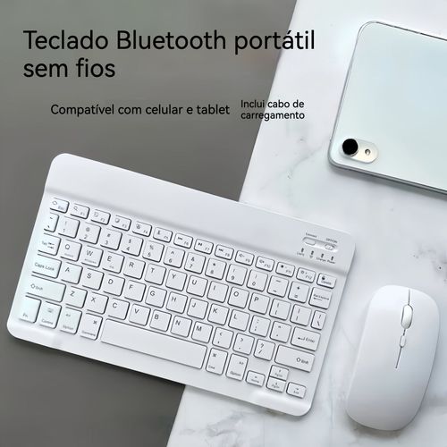 Teclado portátil sem fios Bluetooth, compatível com telemóveis e tablets, suporta vários sistemas operativos.